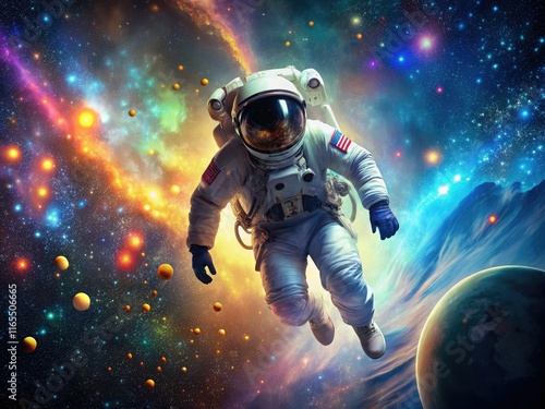 Astronaut in Space, Colorful Specks, Space Exploration, Copy Space