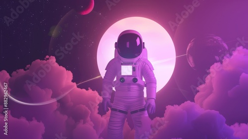 Astronaut in thick purple fog on alien planet, cartoon style with dark lighting.
