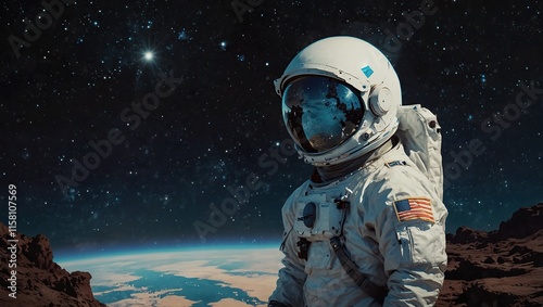 Astronaut on Alien Planet Gazing at Earth and Stars Dramatic Space Exploration Scene Digital Art