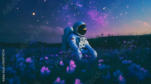 Astronaut seated in a vibrant field of purple flowers, gazing at the starry sky, evoking themes of solitude and wonder in an alien landscape.