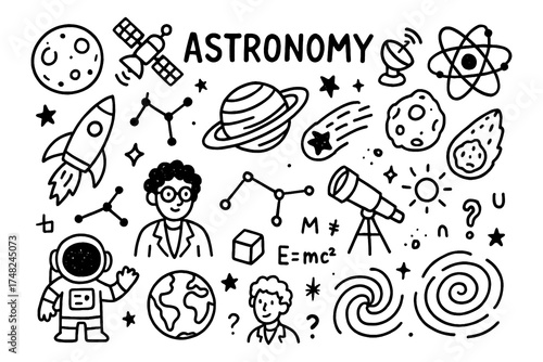 Astronomy concept doodle with planets, stars, and telescope icons, Transparent Background