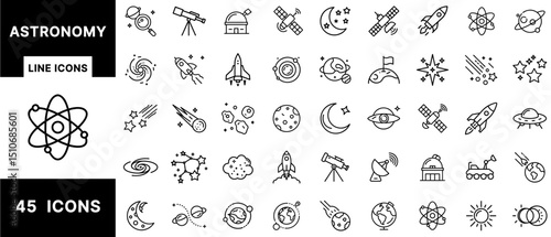 Astronomy Line Icons Set Featuring Telescopes, Satellites, Planets, Moons, Stars, Galaxies, UFOs, Comets, Rockets, Orbit Diagrams, and Solar Systems