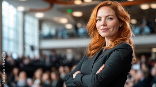 At a corporate event, a red-haired woman in black attire confidently addresses the audience, symbolizing leadership, eloquence, and determination in a packed room.