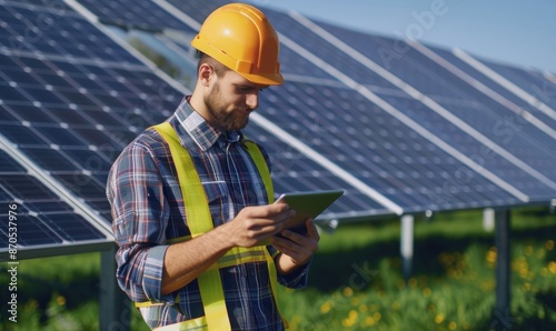 At daybreak, a committed engineer inspects solar panels at an energy farm, utilizing a tablet to enhance the systems operation and maintenance for improved efficiency and sustainability