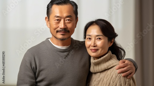 At home, an Asian couple in their middle age shares a loving moment, wrapped in each other's arms.