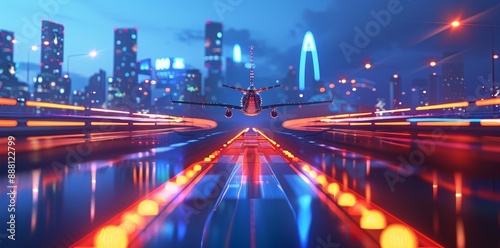 At night, a futuristic airport with aircraft and holographic displays is shown