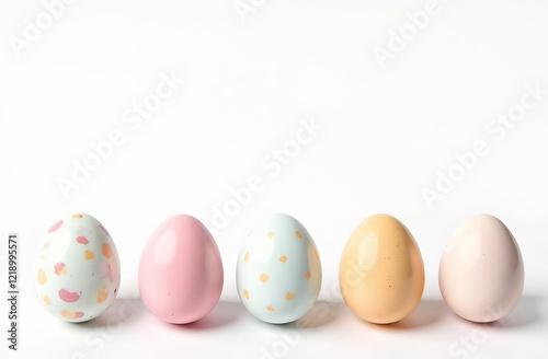At the bottom of the image are eggs with free space on top of image for text, spring pattern on the eggs, pastel colors, white background.