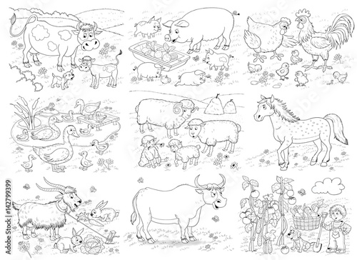 At the farm. Set of illustrations cute farm animals and vegetable garden. Coloring page