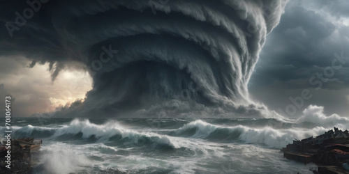 at the ocean, Super Cyclone forming destruction over a landscape, strike colored. ai generative