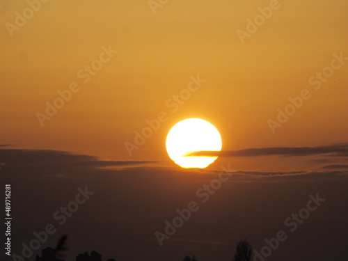 atardecer con gran sol blanco sobre un ocaso gris y naranja, lérida, españa, europa