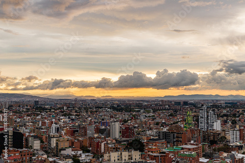 Atardecer dramático sobre Bogotá con nubes densas y paisaje urbano