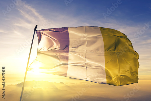 Ath of Hainaut of Belgium flag waving on the top sunrise mist fog