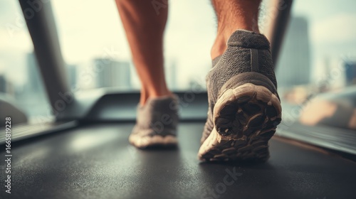 athlete runner feet running on treadmill closeup on shoe jogger fitness shoe in the background and open space around him runner jogging training workout exercising power walking outdoors in city no l