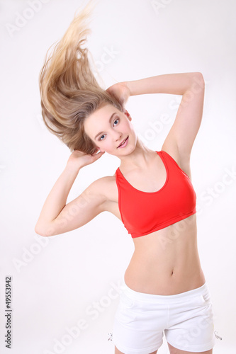athlete woman with long blowing hair over white