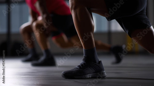 Athletes doing lunges indoors during intense fitness training session.