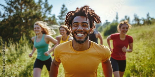 Athletes happily run together outdoors in a park, enjoying the benefits of exercising in nature. Smiling, energetic, and motivated, they blend sportswear with the vibrant landscape
