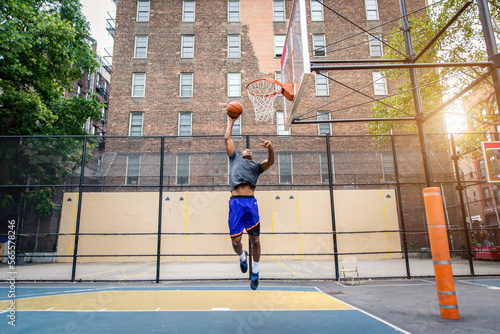 Athletic african american basketball player training on a court in New York - Sportive man playing basket outdoors