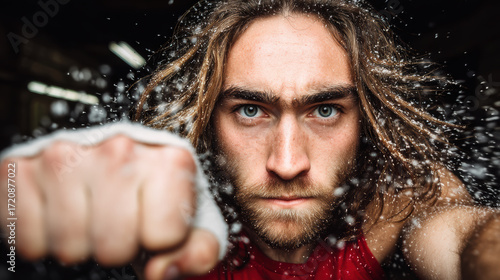 Athletic fighter with bandaged fist in mid punch, sweat and moisture droplets flying, intense focused expression in gritty indoor fight setting
