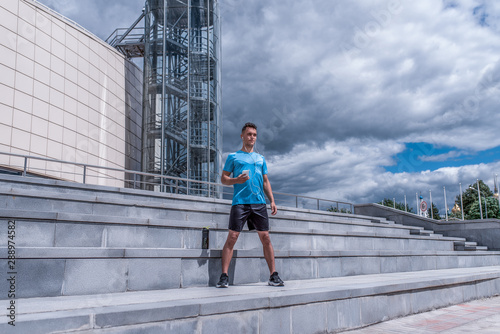 Athletic male athlete, summer city stands hand phone listens music headphones motivation fitness sports workout, sportswear, morning workout. Active lifestyle young people powerful stylish man.