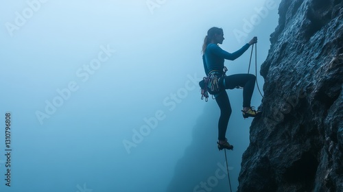 Athletic man scaling a steep cliff, silhouette with a dramatic mountain backdrop and twilight sky