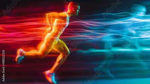 athletic movement captured in motion, sport performance art, dream-like blur effects, glowing color transitions, dynamic running pose, contemporary fitness aesthetic, abstract sports imagery
