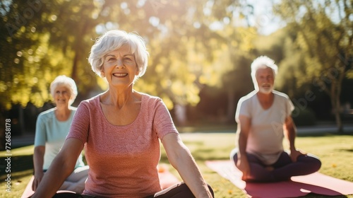 Athletic older women exercise in the garden during a group workout - Mature women do yoga, stretching, fitness in the park on a summer day, Healthy lifestyle
