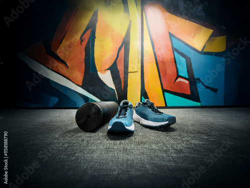 Athletic shoes and foam roller rest on a textured floor against a vibrant graffiti wall, illuminated by dramatic lighting. The scene evokes fitness and urban style.