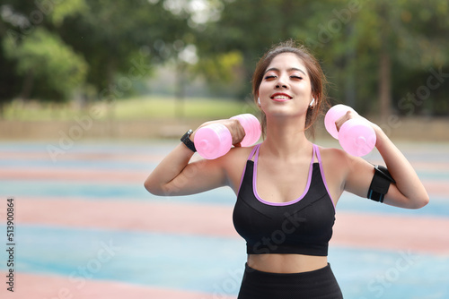 athletic young beauty asian woman in sportswear standing and lifting dumbbells outdoor for morning exercise. Active girl work out on biceps exercise with green tree background. Sport concept