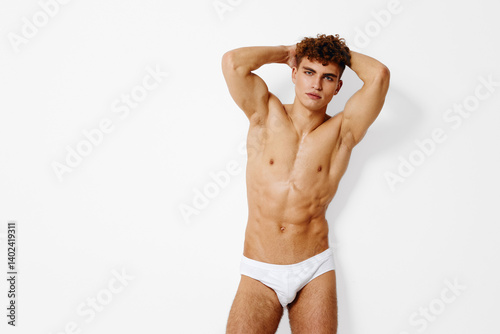 Athletic young man posing confidently in white underwear against a white background, showcasing a fit physique and strong emotions. Body positivity and confidence theme.