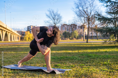 Athletic Young Man Practicing Yoga Poses At Sunset In A City Park