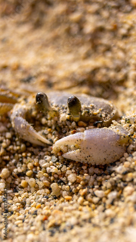 Atlantic ghost crab on a sandy caribbean beach, close-up macro in Colombia