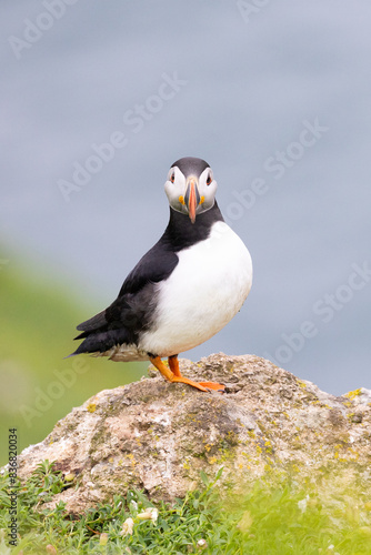 Atlantic puffin (fratercula arctica) standing on a rock with the sea in the background