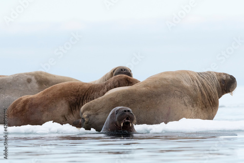 Atlantic walruses (Odobenus rosmarus) on and around iceberg, Vibebukta, Austfonna, Nordaustlandet, Svalbard, Norway