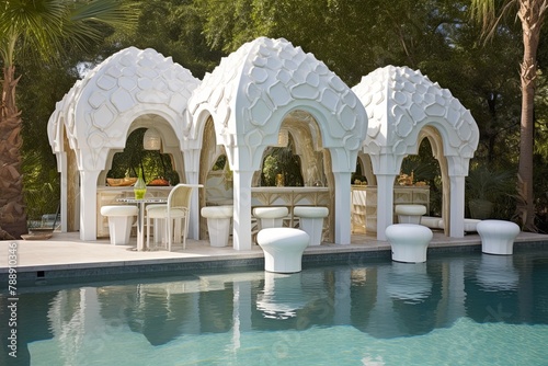Atlantis Pool Designs: Pearl White Cabanas & Aquatic Bar Stools Oasis