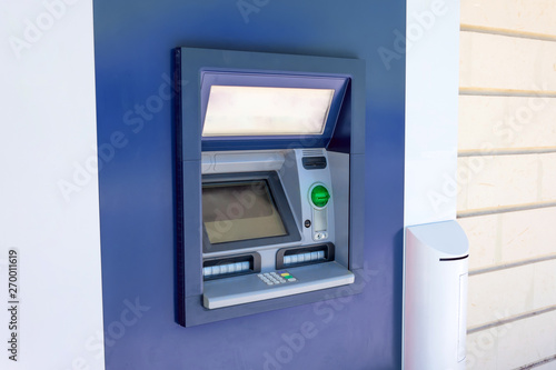 ATM cash machine in the wall of a building on a city street, operating and functional, no people near.