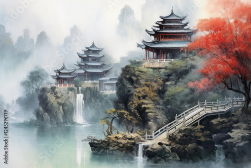 atmosphere of a traditional oriental landscape, executed in the style of Chinese or Japanese painting.