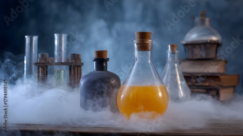 Atmospheric laboratory setting filled with mystical potions swirling smoke and antique scientific equipment
