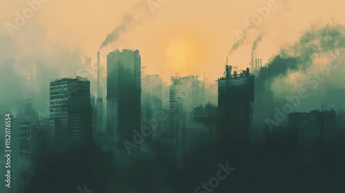 Atmospheric Urban Landscape with Industrial Smoke Emission, Fog, and Dull Yellow Sunlight Casting Shadow Over City Buildings at Dusk