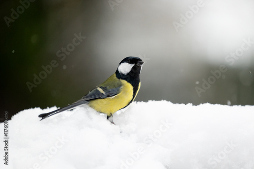 Atmospheric, winter snow scene of a Great Tit (Parus major) standing on fresh snow with snow falling around - Yorkshire, UK in January
