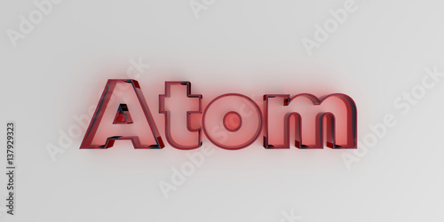 Atom - Red glass text on white background - 3D rendered royalty free stock image.
