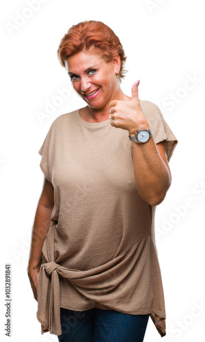 Atrractive senior caucasian redhead woman over isolated background doing happy thumbs up gesture with hand. Approving expression looking at the camera with showing success.