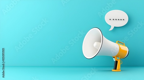 Attention grabbing 3D rendered megaphone with a speech bubble on a bold solid teal background perfect for showcasing promotional content marketing campaigns and business announcements