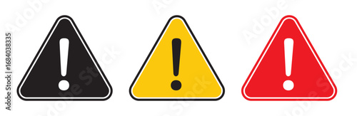 Attention Icon Set. Danger Caution or Alert Risk Warning Vector Symbol in a black filled and outlined style. Safety Notice Sign.