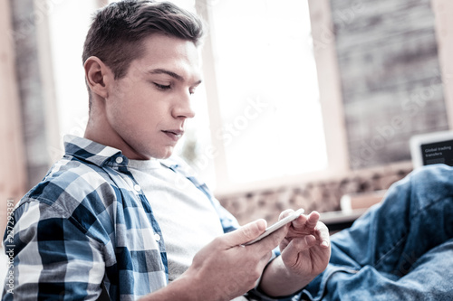 Attention. Serious young person sitting alone and thoughtfully looking at the screen of his modern device while reading messages