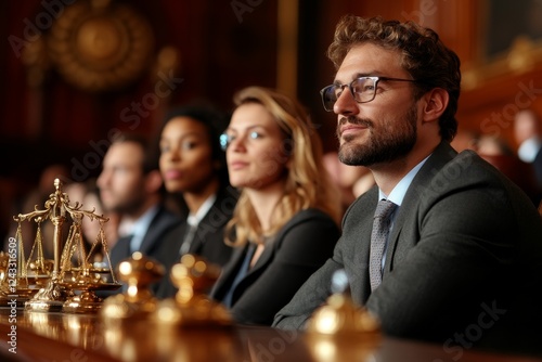 Attentive jury members listen intently during a courtroom trial, showing focus and engagement in legal proceedings