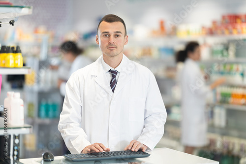 Attentive young man apothecary standing at the stand with his hand on keyboard in big pharmacy