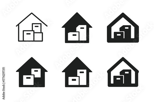Attic Storage Logos. Reorganizing the attic for more storage. Set Logo of attic roof with storage boxes: Minimal outline, Filled silhouette, Abstract