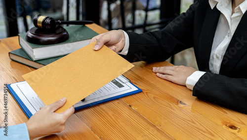 Attorneys are accepting documents from clients who come in to testify in case of embezzlement from business partners who venture into business. The concept of hiring a lawyer for legal proceedings.