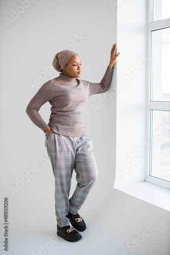 Attractive african american muslim woman in headscarf and casual clothes standing in studio with white background and looking at window. Concept of people and lifestyles.