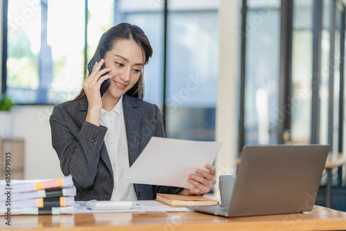 Attractive and professional Asian businesswoman talking on the phone with her business partner Manage or negotiate collaborative and sales agreements.